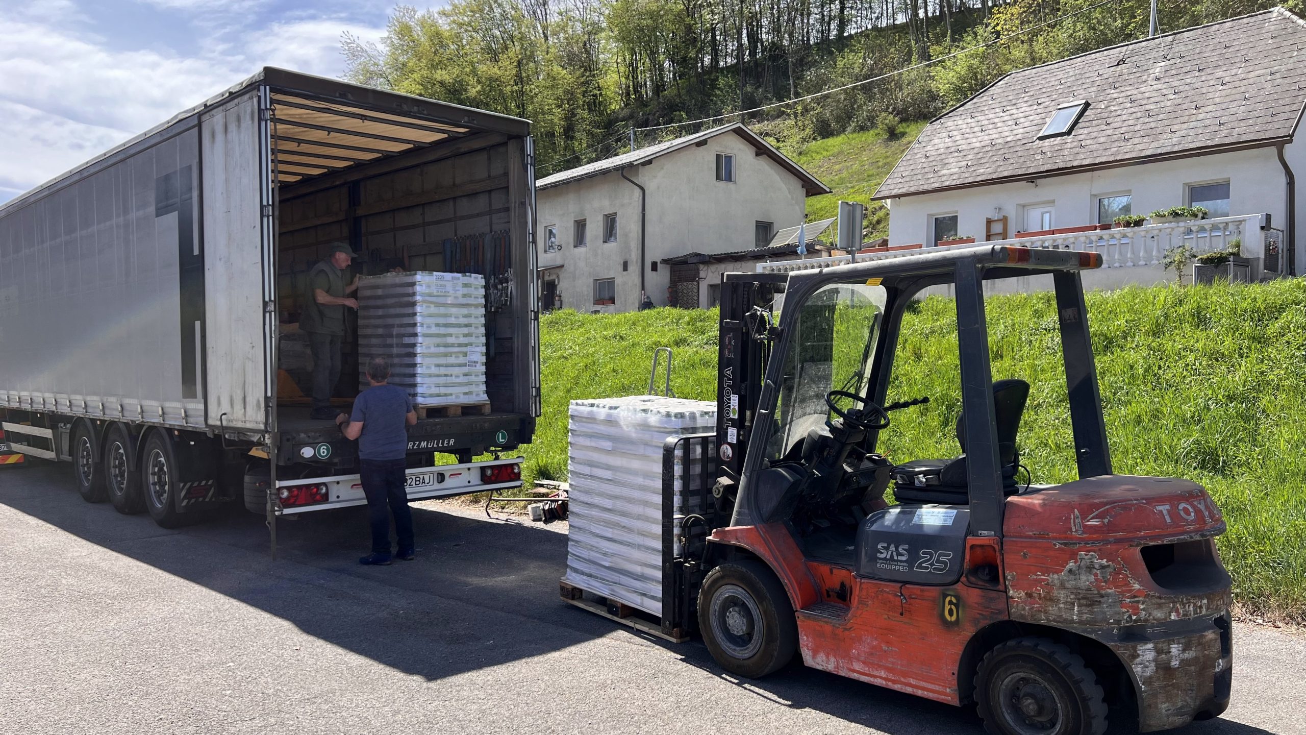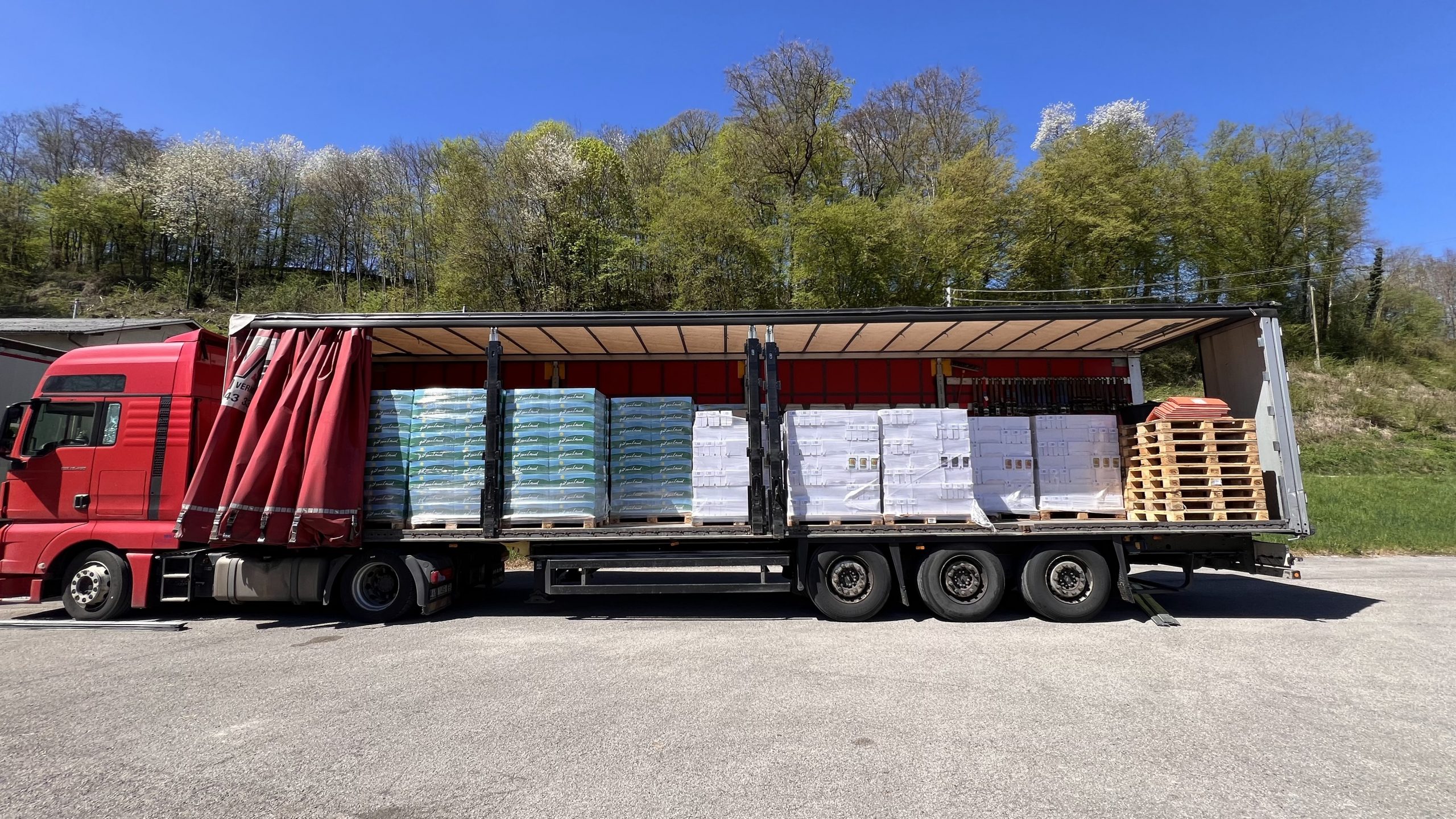 Heute hatten wir gleich zwei LKW-Sattelzüge in unserem Lager in Grünburg. Der eine brachte 33 Paletten Lebensmittel, und der andere wurde mit Ware – 33 Paletten – für Rumänien beladen. Dank unserer Sponsoren haben wir schon genügend Ware im Lager, um bereits den nächsten Transport zu organisieren!