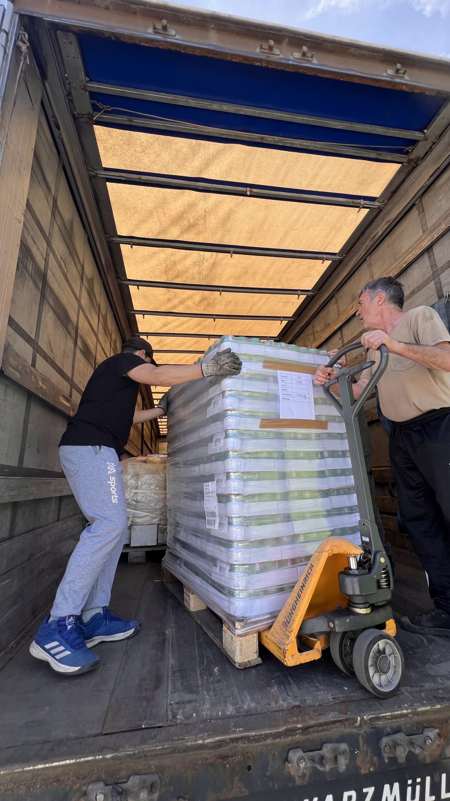 Am 22. August haben wir bereits die nächste Lieferung von 33 Paletten mit Fertiggerichten von unserem Lebensmittel-Sponsor erhalten. Das entspricht ca. 30000 Mahlzeiten!